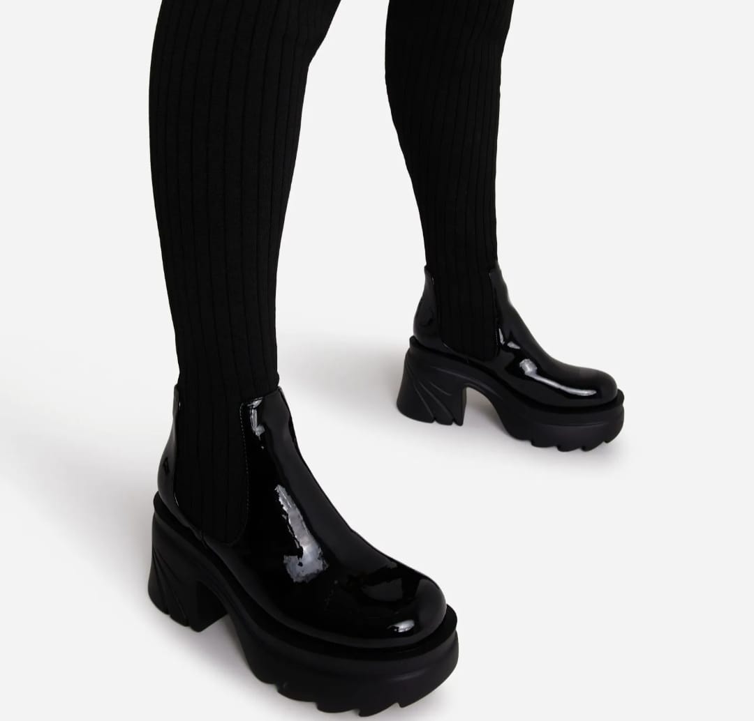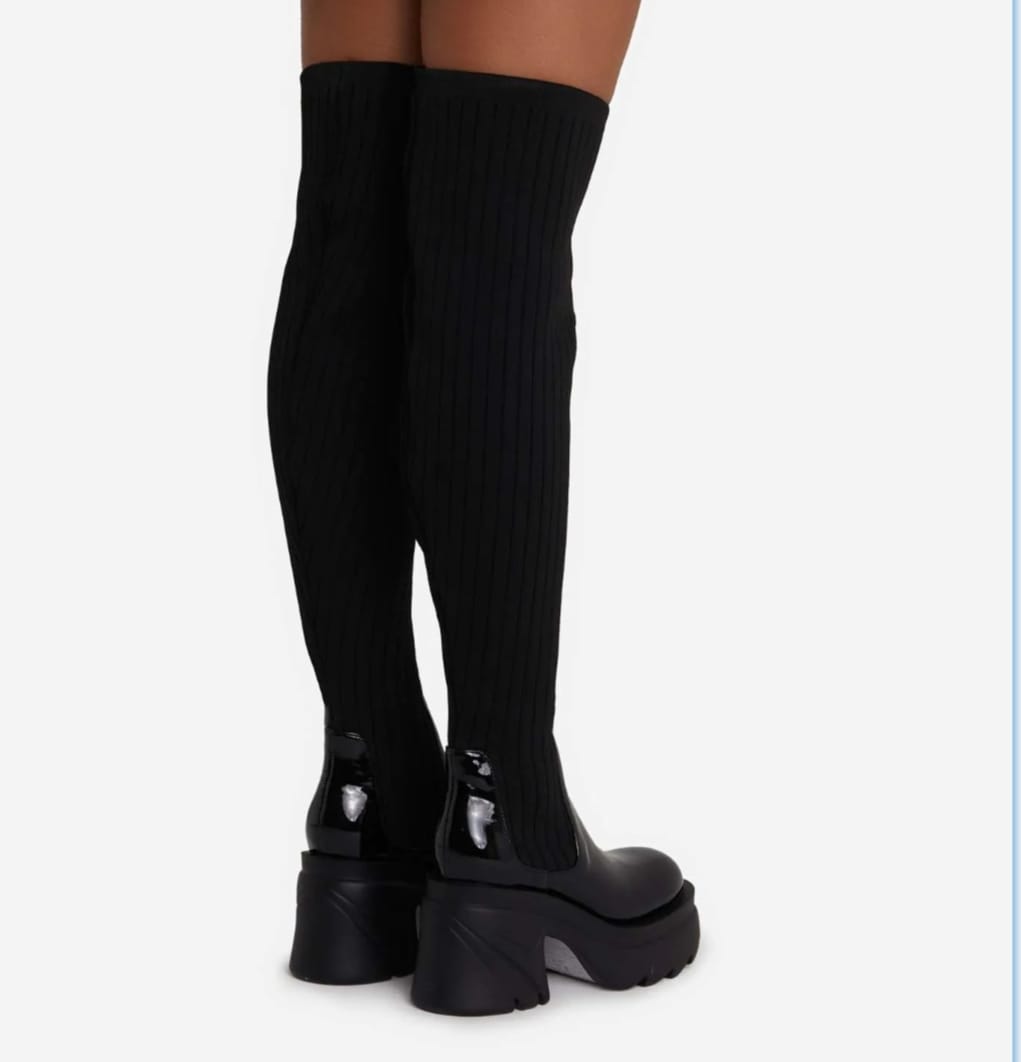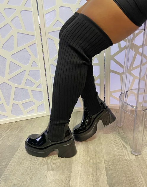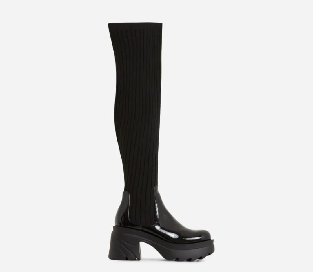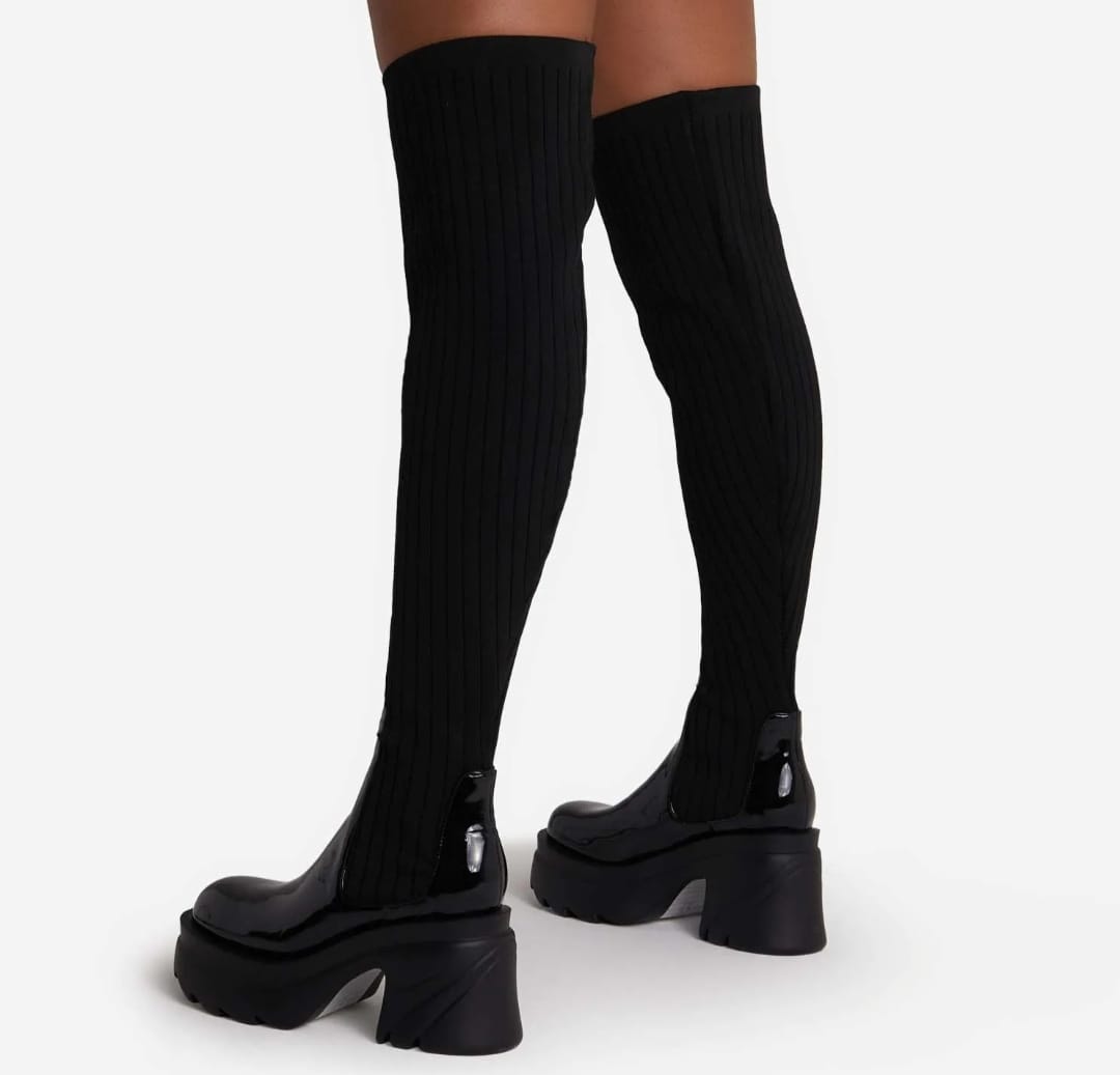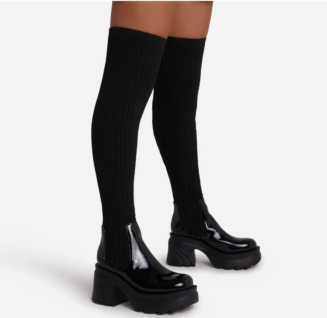Give your A/W wardrobe a serious update with these must-have boots. Featuring a patent/knit material with a chunky sole and an OTK thigh high length.