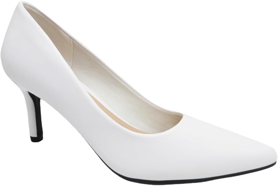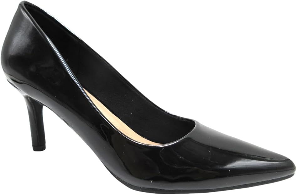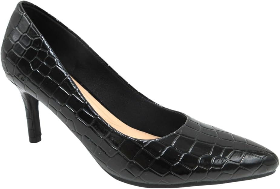 Step into timeless sophistication with these classic pointed toe pumps. The sleek black pump features an elegant stiletto heel that adds both height and confidence to your stride. Perfect for professional settings, these versatile pumps complement both business attire and formal wear with their clean lines and refined silhouette. The pointed toe elongates your legs while maintaining a professional appearance, making these shoes an essential addition to any working woman's wardrobe. The moderate heel height strikes an ideal balance between style and comfort for all-day wear at the office or special occasions. These pumps offer the perfect blend of classic design and contemporary style, ensuring they'll remain a staple in your professional footwear collection for years to come.